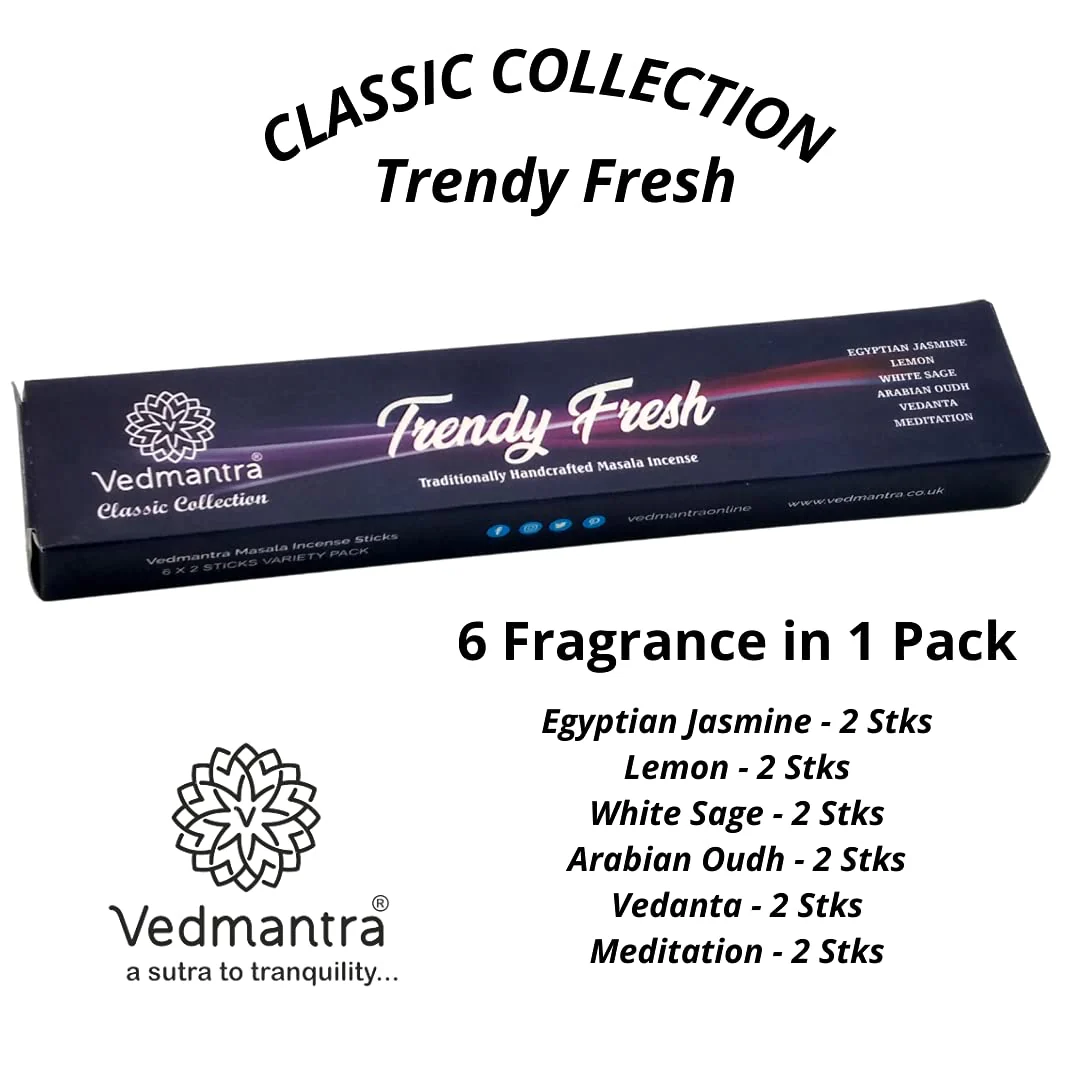 Contents: 2 sticks each of: Egyptian Jasmine, Lemon, White Sage, Arabian Oudh, Vedanta, Meditation