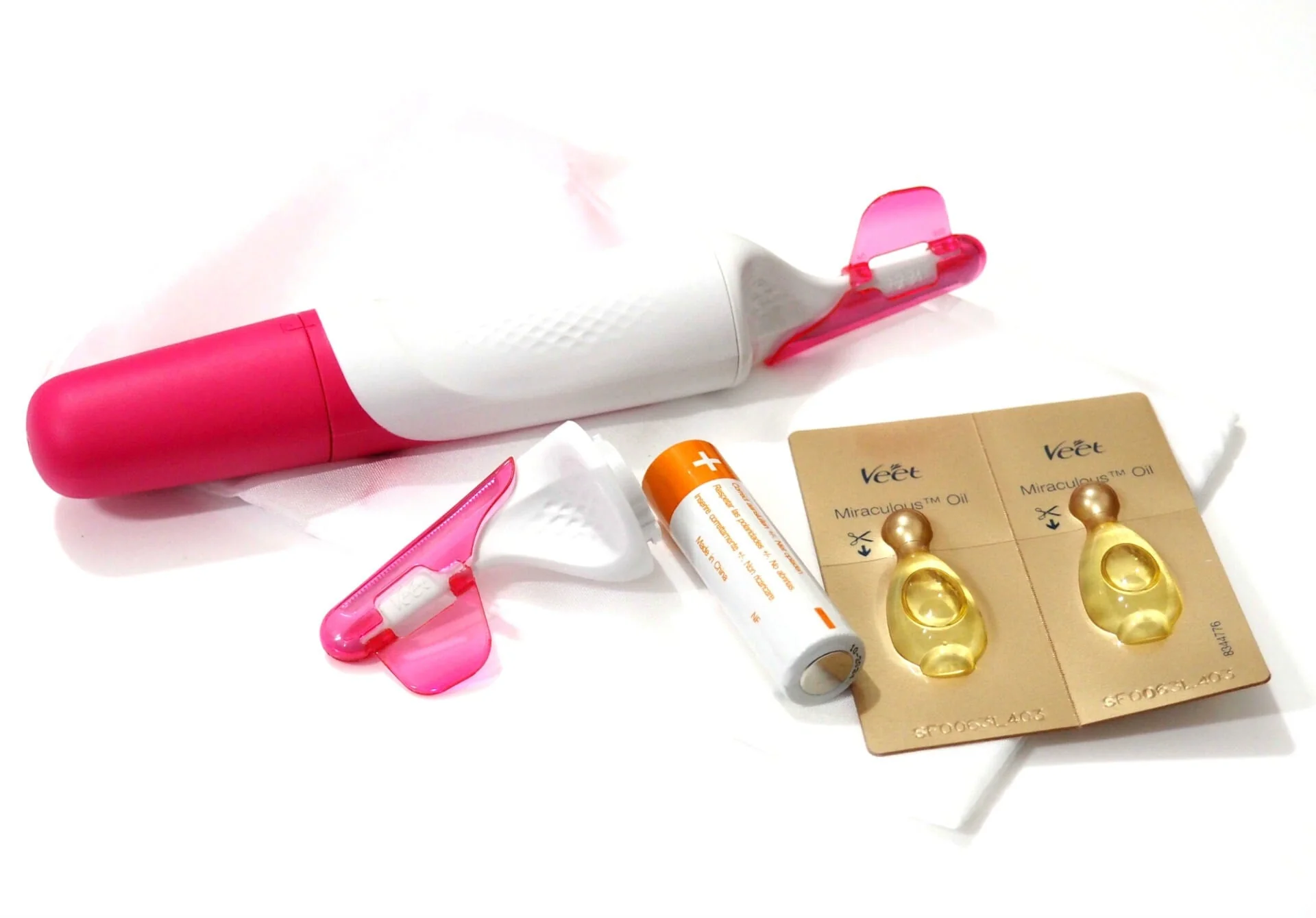 Veet Miraculous Oil Monodose Ingredients: Helianthus Annuus Seed Oil, Prunus Amygdalus Dulcis Oil, Prunus Armeniaca Kernel Oil, Parfum, Argania Spinosa Kernel Oil, Butyrospermum Parkii Butter, Persea Gratissima Oil, Camelina Sativa Seed Oil, Benzyl Salicylate, Linalool, Alpha-isomethyl Ionone, Limonene, Hydroxycitronellal, Citronellol, Coumarin, Citric Acid. The Set Contains 1 Gadget 2 Face Refills 2 Monodose Of Veet Miraculous Oil 1 Pouch To Store The Device 1 Aa Battery